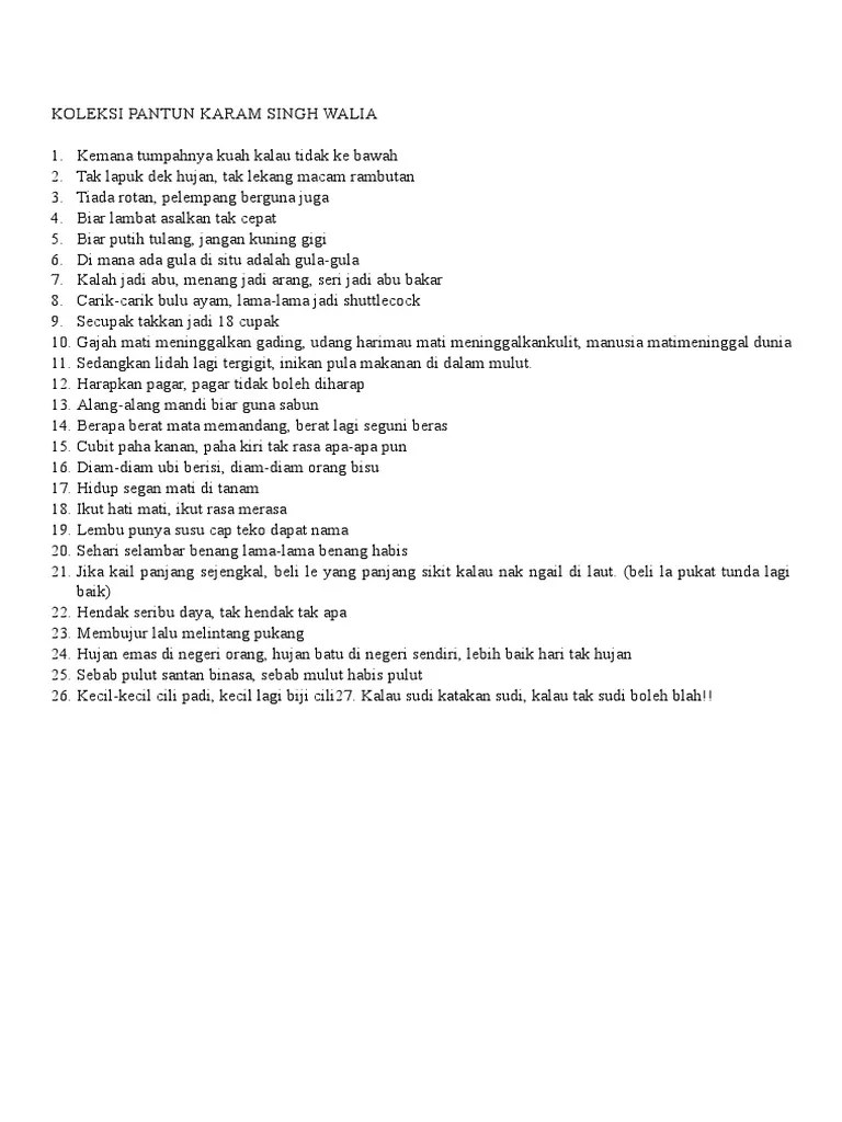 Nov 18 2009, 02:12 pm post #7. Kemana tumpahnya kuah kalau tidak ke bawah 2. Tak lapuk dek hujan, tak lekang macam rambutan. The exclusive biography of dato karam singh walia karamsinghwalia tv3karamsinghwalia pantunkarams . Aku membesar tengok dia kat tv selamba gila baca peribahasa la, pantun semua. Bekas wartawan tv3, karam singh walia, dikaitkan dengan pantun empat kerat yang menegur pemimpin bergaji besar.